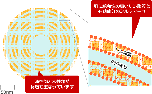 フラーレンと、 5種類の「ヒト型セラミド」をより深く、お肌に届けるために独自のマルチラメラリポソーム技術を採用。この贅沢すぎる美容成分を何層にも重なるカプセルにして閉じ込めました。肌へ浸透しながら、たまねぎの皮が剥れるように外から1枚ずつ溶け出して肌に栄養を与えながらうるおします。厳選した成分をしっかり届けて長くとどまらせます。